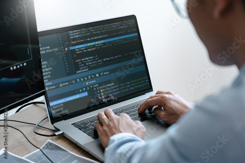 Programmer Typing Code on desktop computer, Developing programming and coding technologies concept.