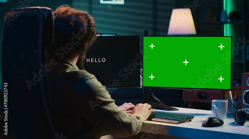 Programmer updating artificial intelligence algorithm using green screen PC, making it become sentient. IT specialist programming self aware AI with mockup computer, camera A