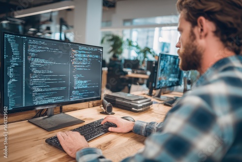 Programmer working efficiently at modern IT office during the day typing code on dual monitors with a focus on software development and programming tasks