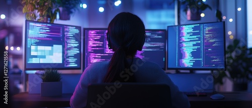 Programmer working late at night with multiple monitors displaying code, focused on software development in a modern tech workspace