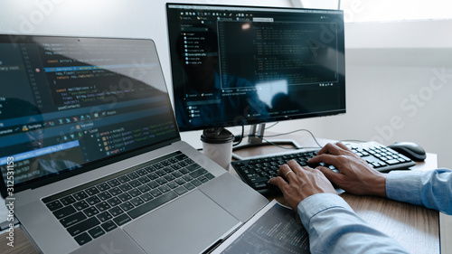 Programmer working On Computer In IT Office Typing Data Coding in software and checking code on computer screen.