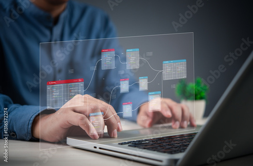 programmer working on database web developer management with a futuristic digital interface, representing data analytics and IT technology.