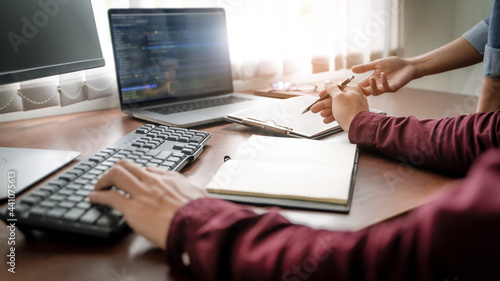 programmer writing program code with two monitors and working on a new software or hacker programming developing software applications