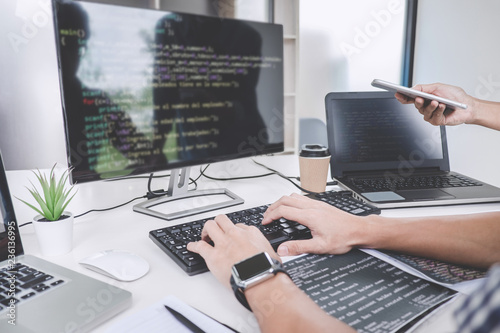 Programmers cooperating at Developing programming and website working in a software develop company office, writing codes and typing data code