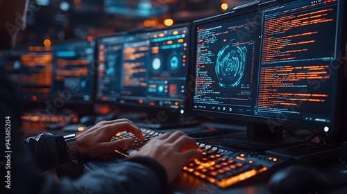 Programmer's Hands Coding on a Keyboard With Multiple Monitors in the Background Displaying Lines of Code