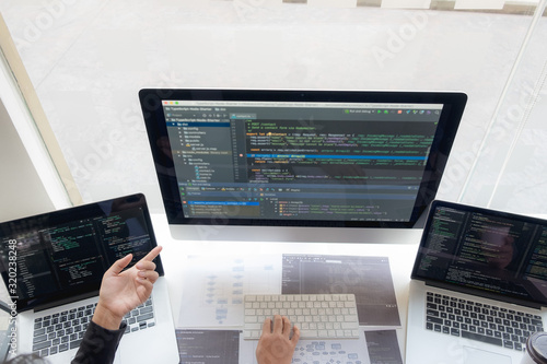 Programmers work on the development of coding and coding technology on white desks and website design, software, data processing companies, servers.