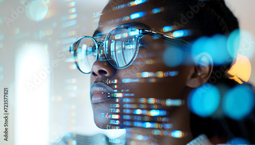 Programming, ai code and woman with focus, hologram and digital software with cyber security, futuristic and website development. Female, coder or trader with data analysis and security at night