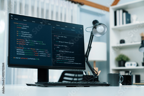 Programming code on computer screen desktop placing on working desk showing intelligent website development coder system running database online with information technology design concept. Infobahn.
