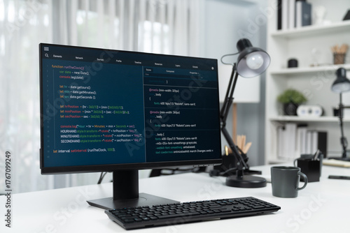 Programming code on computer screen desktop placing on working desk showing intelligent website development coder system running database online with information technology design concept. Infobahn.