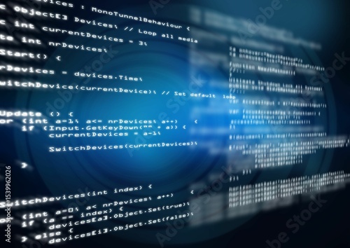 Programming code text overlay is showing in flat design interface, with glowing concentric circles
