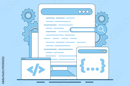 Programming Concept, Software development and programming, program code on laptop screen, big data processing, computing, programming language. flat vector illustration on background.