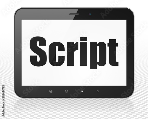 Programming concept: Tablet Pc Computer with black text Script on display, 3D rendering