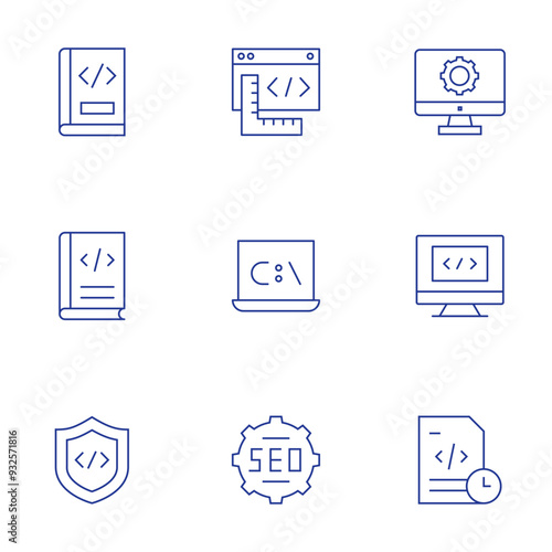Programming icons set. Thin Line style, editable stroke. programming, firewall, time, book, coding, seo, laptop