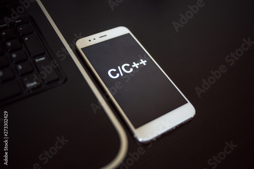 Programming language C plus plus for mobile development, concept. Smartphone near the laptop