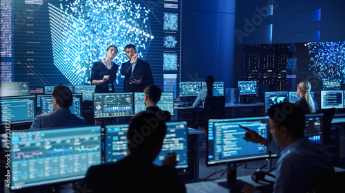 Project Manager and Computer Science Engineer Talking while Using A Digital Tablet Computer. Telecommunications System Control Monitoring Room with Neural Network on Big Screen.