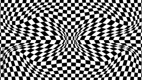 Psychedelic optical illusion. Abstract vector distorted background with black and white square cells. Op art pattern textures.