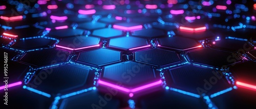 Pulsating grid of glowing hexagons in deep blues and purples, representing the complexity of AI algorithms