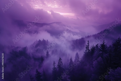 Purple Mist Enveloping a Silhouetted Forest and Mountain Range
