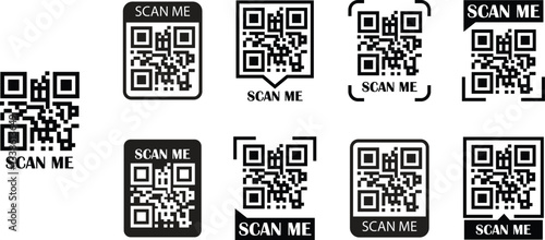 QR Code Scan black icons set. Scan me text vectors. Smartphone usage. Electronic, barcode, digital technology for mobile app, payment, identification and website isolated on transparent background.
