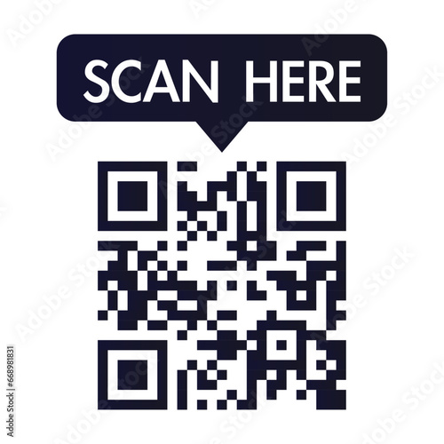 QR code scan here icon for mobile apps and payments. QR code scan for smartphone. Qr code Template scan here QR code for smart phone. Vector illustration.