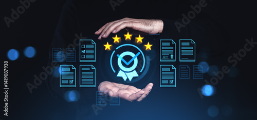 Quality assurance concept with certificate icon and digital documents on dark background.
