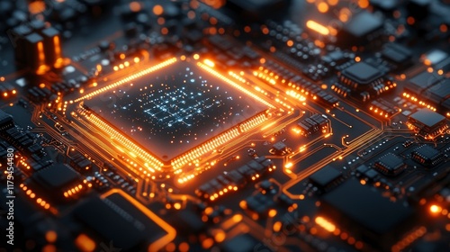 Quantum computer chip with visible atomic-scale components, cool blue lighting