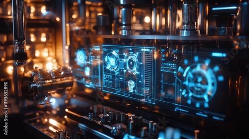 Quantum computer control system featuring holographic screens displaying intricate data visualizations