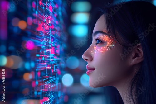 Quantum computing brain machine interface and neurocognitive woman looking at a digital cityscape with a futuristic interface reflecting ai and data driven thinking