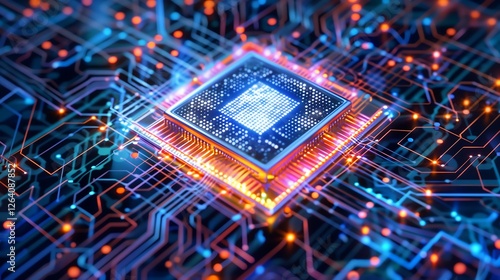 Quantum computing concept with glowing circuits and particles.