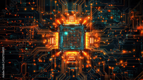 Quantum computing servers operate a data backup system with glowing circuits processing encrypted information in a futuristic cyber environment