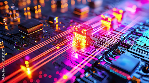 Quantum routers glowing with light particles, visualizing secure quantum data transfer between global communication paths