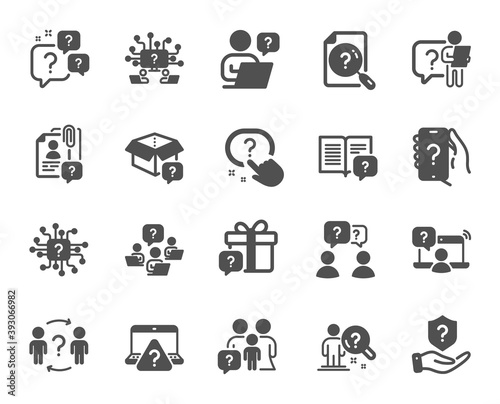 Questions icons. Artificial Intelligence computer, phone with Question mark, Problem solve. Quiz, faq guide, job interview icons. Ask person, question bubble, family problem. Vector