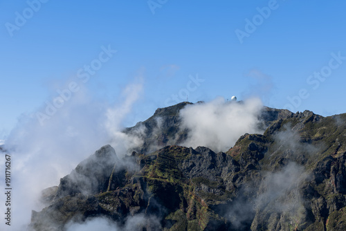 Radar dome on Pico do Arieiro seen from high trail, mist curls around jagged rock towers and steep ravines as sunlit clouds drift past the mountain skyline