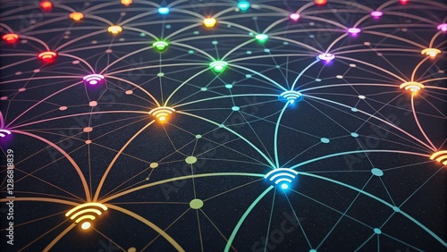 Rainbow Network 3D Render of Interconnected Wifi Nodes, Network Connectivity, Digital Infrastructure, IoT Network, IoT