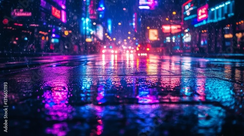 Raindrops create a lively dance on the pavement, reflecting a kaleidoscope of neon lights in a bustling urban setting. Cars glide by, adding energy to the nighttime atmosphere