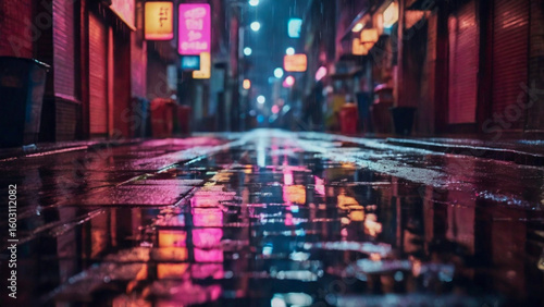 Rainy City Street with Neon Reflections