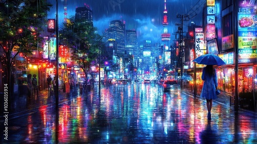 Rainy cityscape with vibrant neon lights.