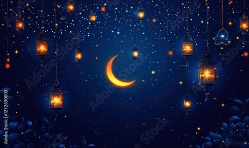 Ramadan lanterns hanging, night sky, crescent moon, foliage background