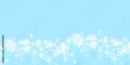 Random falling snow flakes wallpaper. Snowfall dust freeze granules. Snowfall sky white teal blue background. Many snowflakes vector. Snow nature scenery.