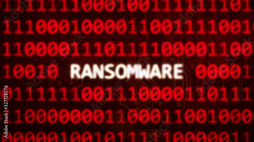 Ransomware text on random binary code red screen - computer technology words series 3D render