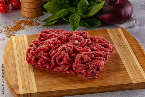 Raw minced beef meat over board
