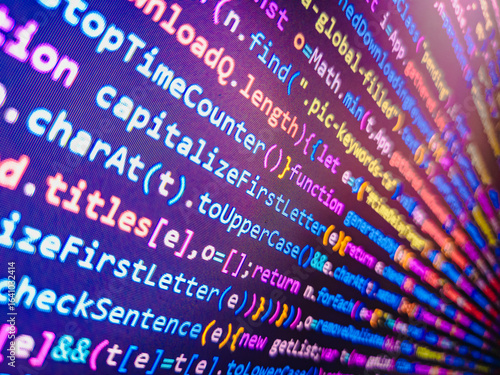 Real Java Script code developing screen. Blue color. Blue theme. Website HTML Code on the Laptop Display Closeup Photo. Coding, programming, hacking concept. Coding cyberspace concept