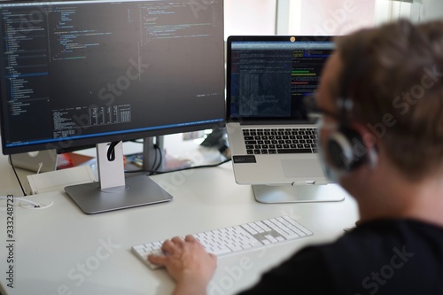 Real male web programmer coding javascript, php, symfony, react at work