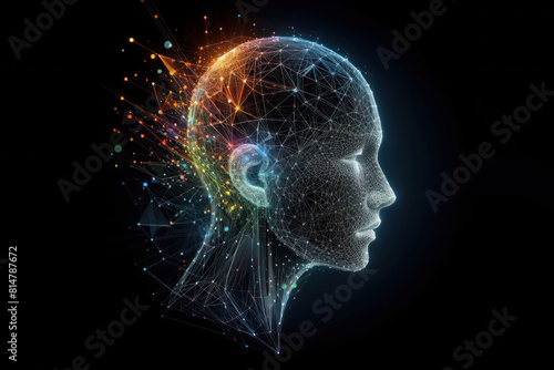 Realistic 3d head representing artificial intelligence, Abstract lines, triangles and particle style design