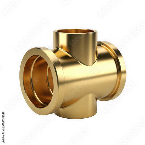 Realistic 3d of a shiny brass plumbing tee fitting with threaded ends isolated on transparent background