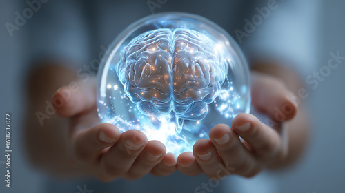 Realistic brain floating in glowing crystal orb, symbolizing knowledge and creativity