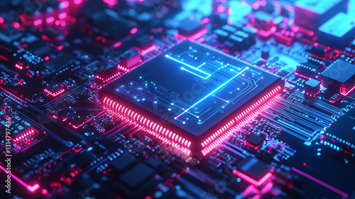Realistic close-up animation of a high-tech AI processor chip with pulsating neon circuits embedded in an advanced quantum computing system