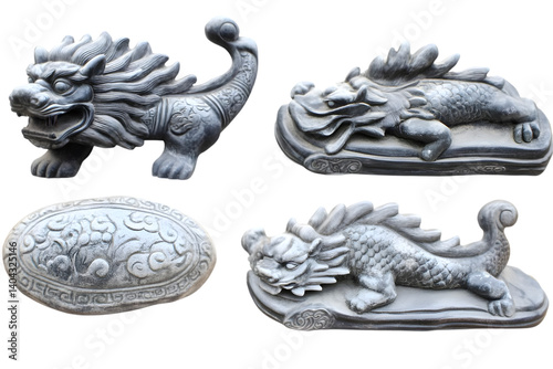 Realistic Stone Dragon Figurines Isolated on Transparent Background