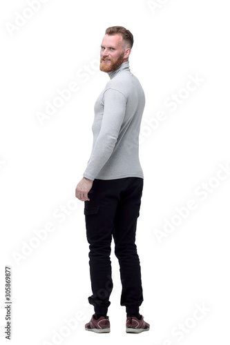rear view. a young man in white looking forward .
