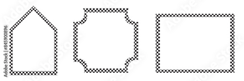 Rectangle frame with checkered print on borders. Rectangular vignette with checkerboard, race flag or chess game pattern isolated on white background. Vector graphic illistration